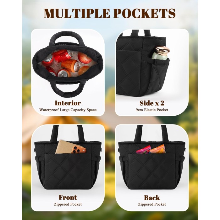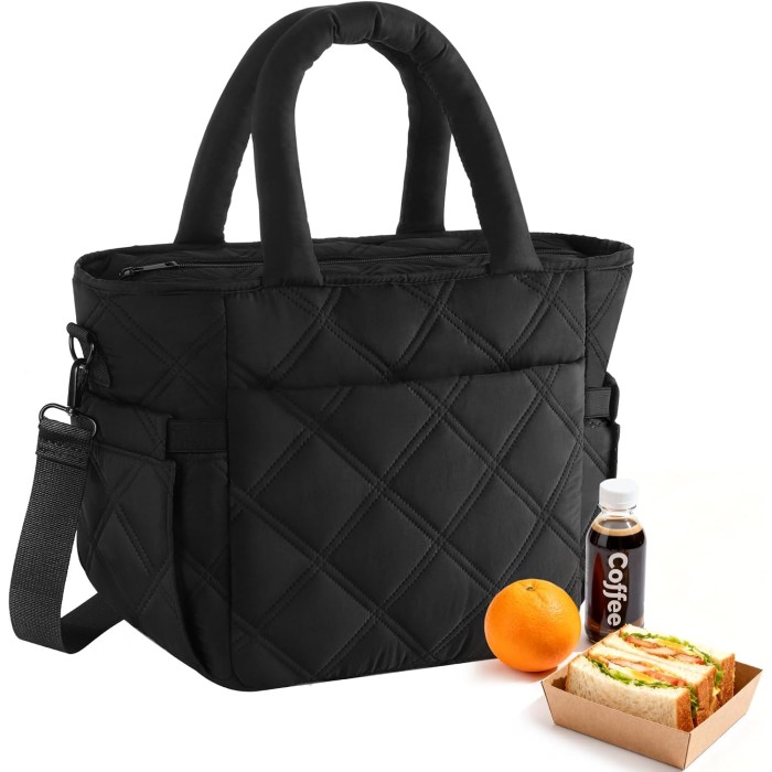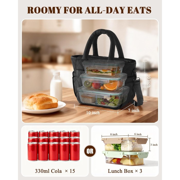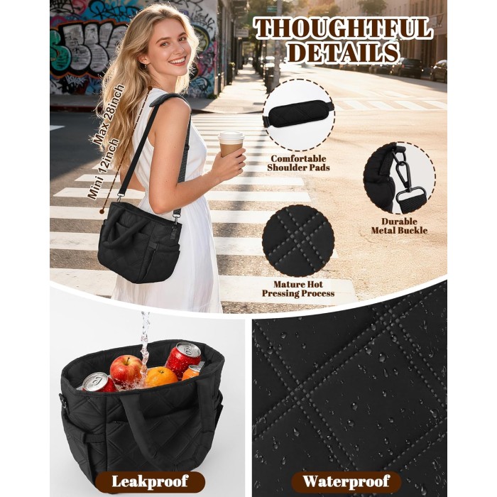 Afuosy Insulated Lunch Box for Women Men, Soft & Puffy Lunch Bag, Large Capacity Leakproof Reusable Tote Cooler Bag with 4 Pockets, Adjustable Strap, Ideal for Work, Outdoors, Picnic, Travel (Black)